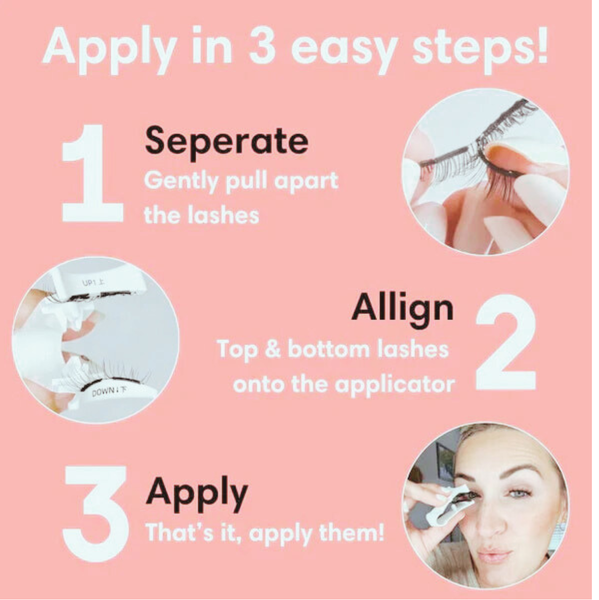 Separate and gently pull the lashes. Align top and Bottom lashes with applicator. The lash will magnetically adhere. Carefully adjust if needed. When you're happy with the placement, lightly press lash down to fully set it.